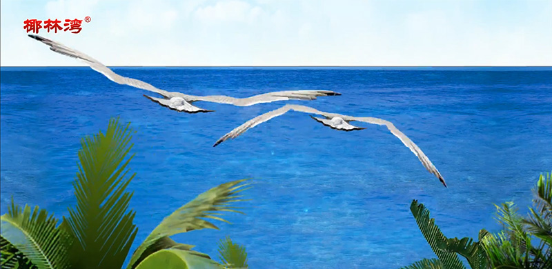 一片洁净的深蓝大海,一片葱郁的椰树林,海鸥扬声飞翔,掠过椰林,留下声声鸟鸣声。